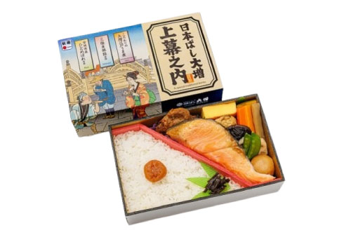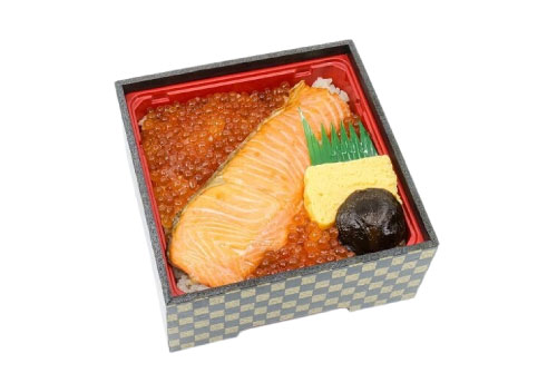 魚介の旨味を炊き込んだ茶飯に、脂がのった三陸産銀鮭の塩焼きと醤油などで漬け込んだマスいくらをふんだんに盛り付けた弁当です。