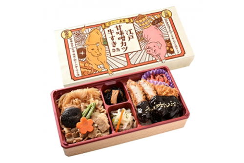 三元豚ロースとんかつに江戸甘味噌を使用した特製だれをかけた味噌カツと甘辛に仕上げた関東風のすき焼きを一緒に盛り付けました。