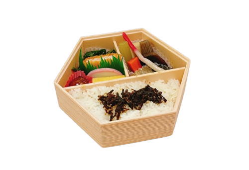 魚介の旨味を炊き込んだ茶飯に、脂がのった三陸産銀鮭の塩焼きと醤油などで漬け込んだマスいくらをふんだんに盛り付けた弁当です。