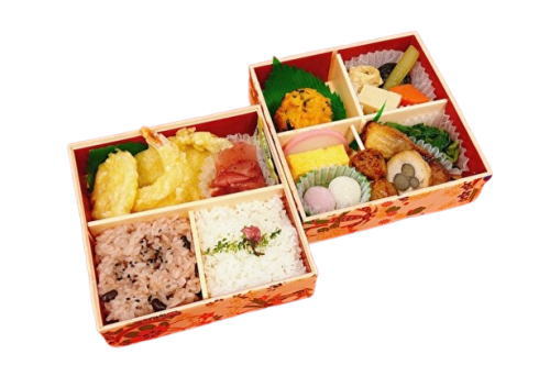 白飯・赤飯・天ぷら(キス、海老、ハス)、煮物、赤魚の西京焼き等を詰めた、二段のお祝い弁当です。
