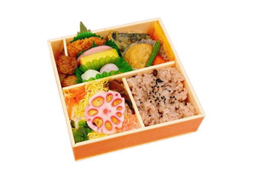 二色御飯と味噌の風味が良い鮭の味噌漬焼き、ご飯に合う牛肉の甘辛煮、天ぷら、煮物などを盛り合わせたお弁当です。