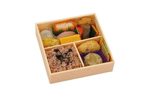 二色御飯と味噌の風味が良い鮭の味噌漬焼き、ご飯に合う牛肉の甘辛煮、天ぷら、煮物などを盛り合わせたお弁当です。